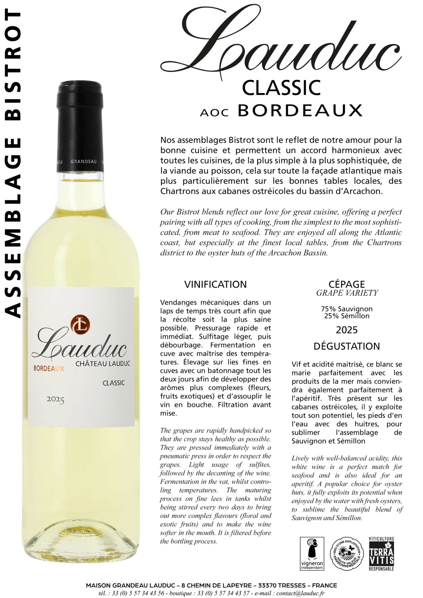 Lively with well-balanced acidity, this white wine is a perfect match for seafood and is also ideal for an aperitif. A popular choice for oyster huts, it fully exploits its potential when enjoyed by the water with fresh oysters, to sublime the beautiful blend of Sauvignon and Sémillon.