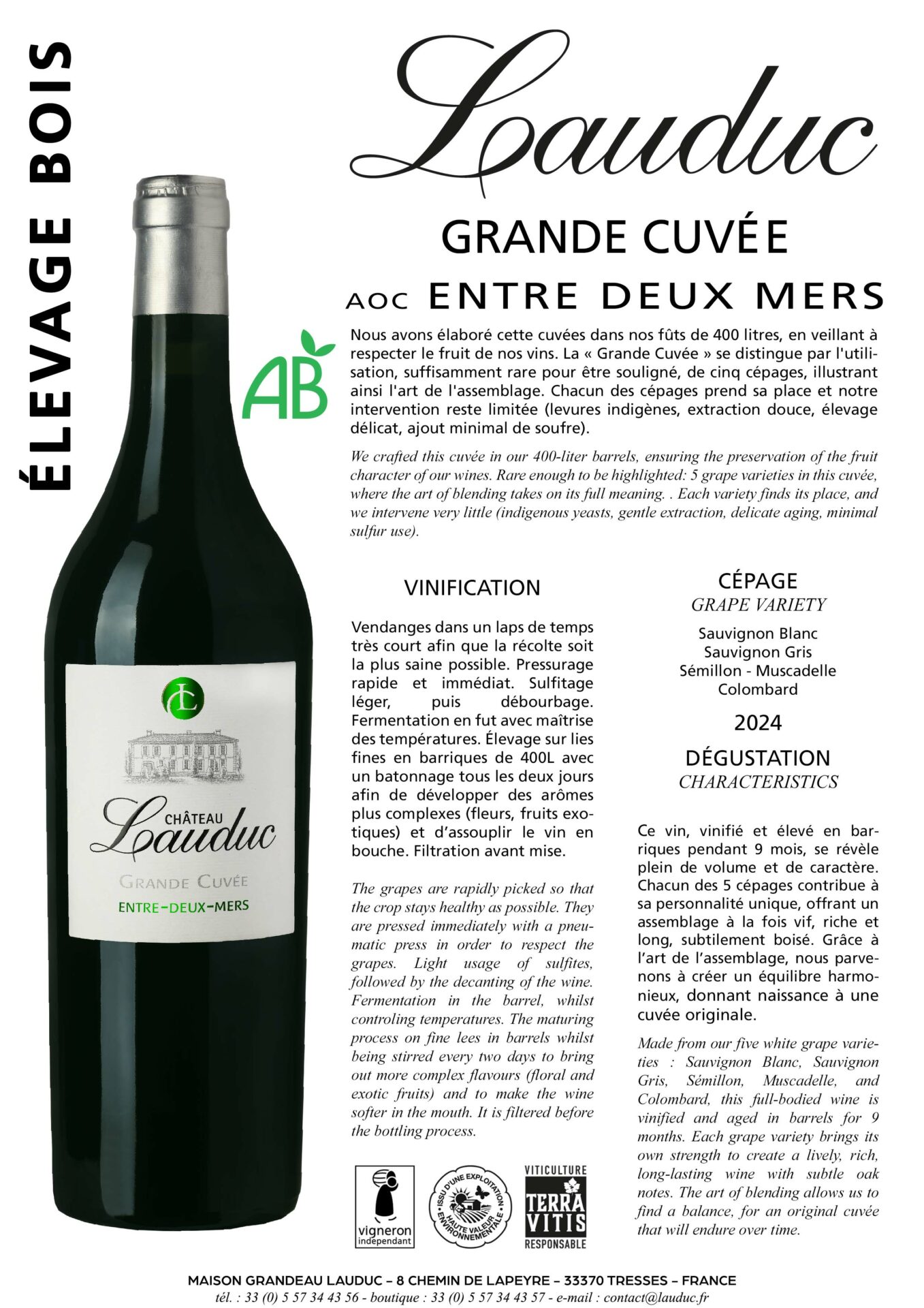Made from our five white grape varieties : Sauvignon Blanc, Sauvignon Gris, Sémillon, Muscadelle, and Colombard, this full-bodied wine is vinified and aged in barrels for 9 months. Each grape variety brings its own strength to create a lively, rich, long-lasting wine with subtle oak notes. The art of blending allows us to find a balance, for an original cuvée that will endure over time.